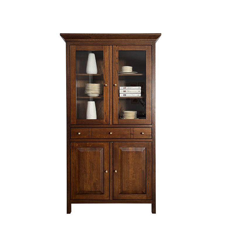 GÓRA DRZWICZKI PRZESZKLONE Z DWOMA PÓŁKAMI W ŚRODKU, 1 DŁUGA SZUFLADA, NA DOLE DRZWICZKI PEŁNE Z 1 PÓŁKĄ W ŚRODKU